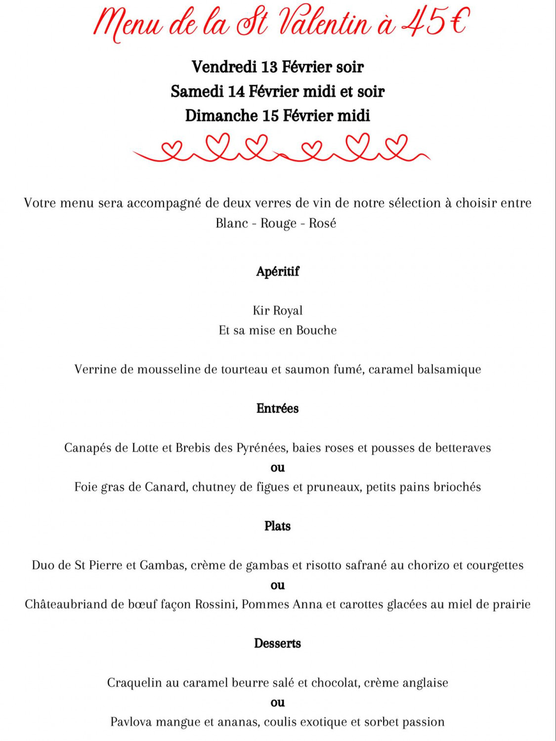 Le service a été impeccable et les mets délicieux pour le cocktail dejeunatoire et nous avons été très satisfaits de la formule du soir tant sur la qualité que sur la quantité.